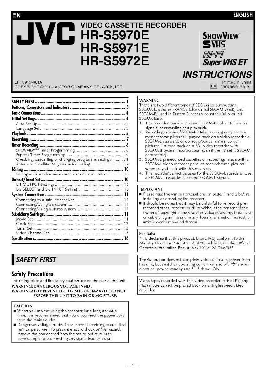JVC HR-S5970E HR-S5971E HR-S5972E VCR Owners Instruction Manual