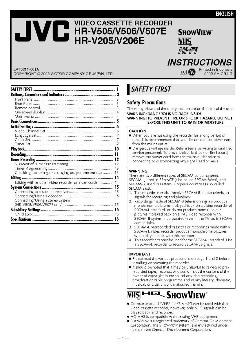 JVC HR-V505 HR-V506 HR-V507E HR-V205 HR-V206E VCR Owners Manual