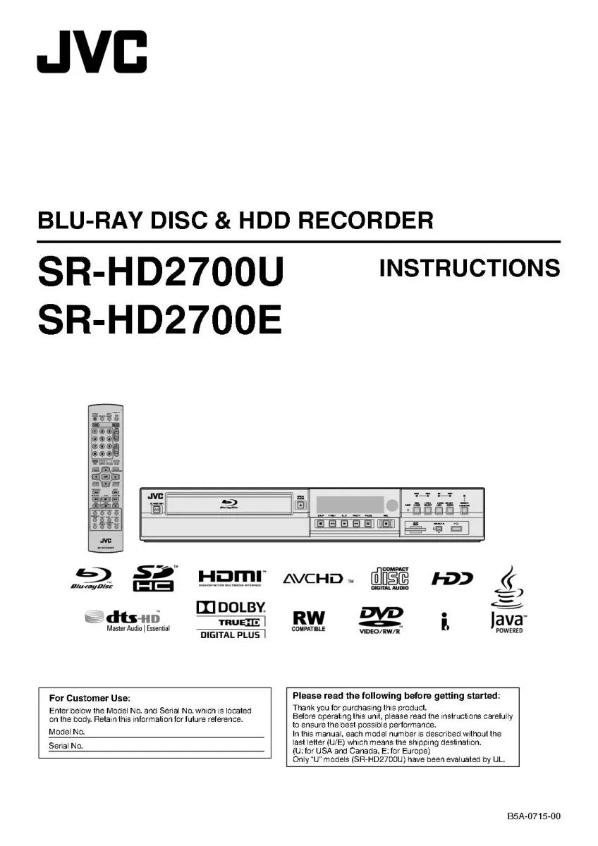 JVC SR-HD2700 Blu-ray Player Owners Instruction Manual