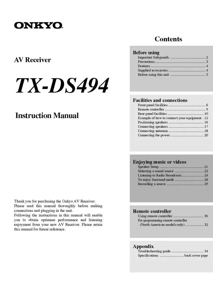 Onkyo Integra TX-DS494 Receiver Owners Instruction Manual