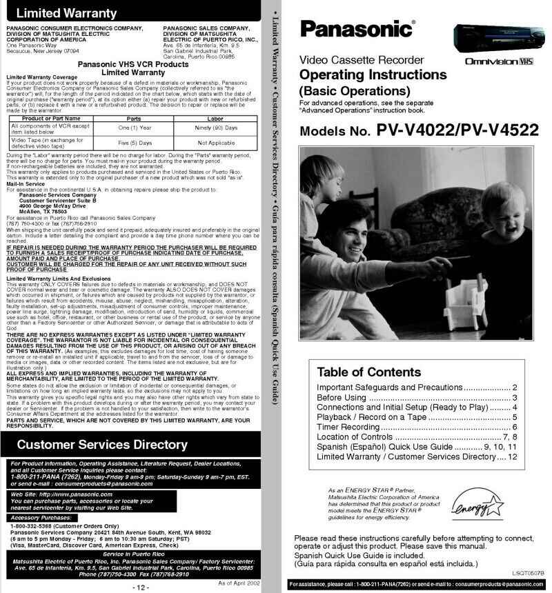Hard copy printed manual. This Panasonic VCR manual will ship within 24 hours of purchase. Read more