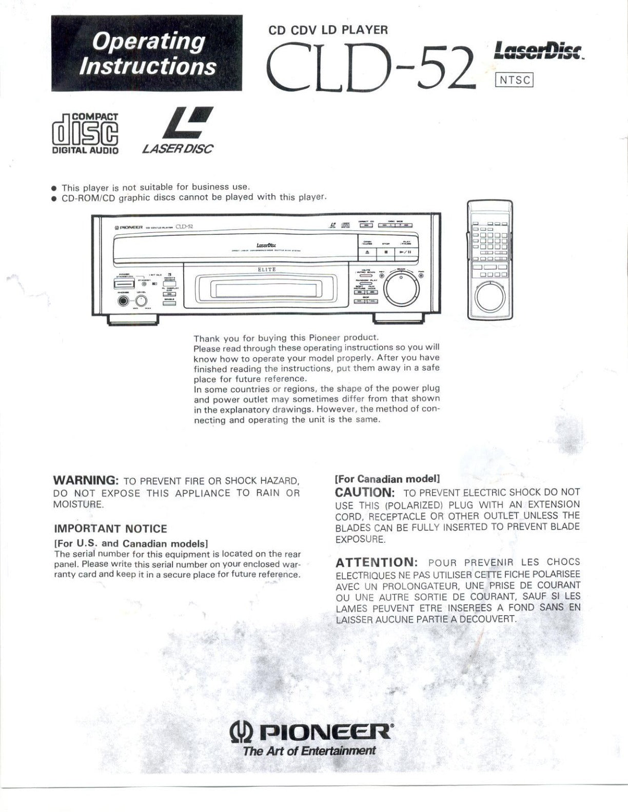 PIONEER CLD-52 Laser Disc Player Owners Instruction Manual