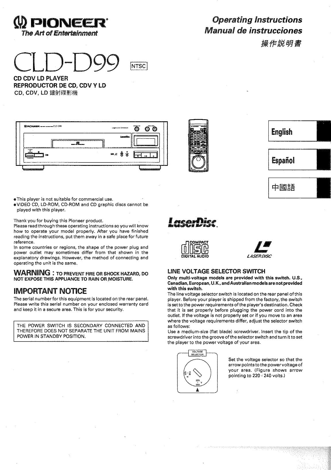 PIONEER CLD-D99 Laser Disc Player Owners Instruction Manual