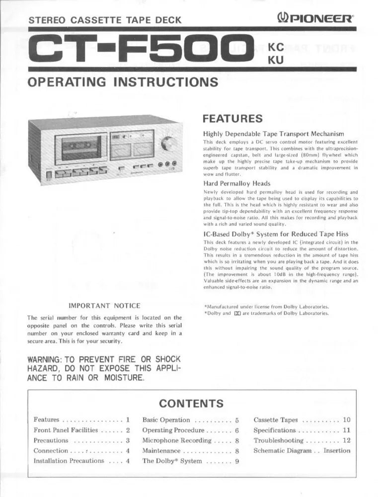 Pioneer CTF-500 Cassette Player Owners Manual