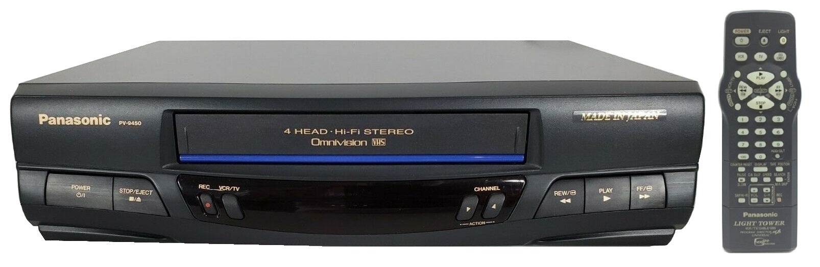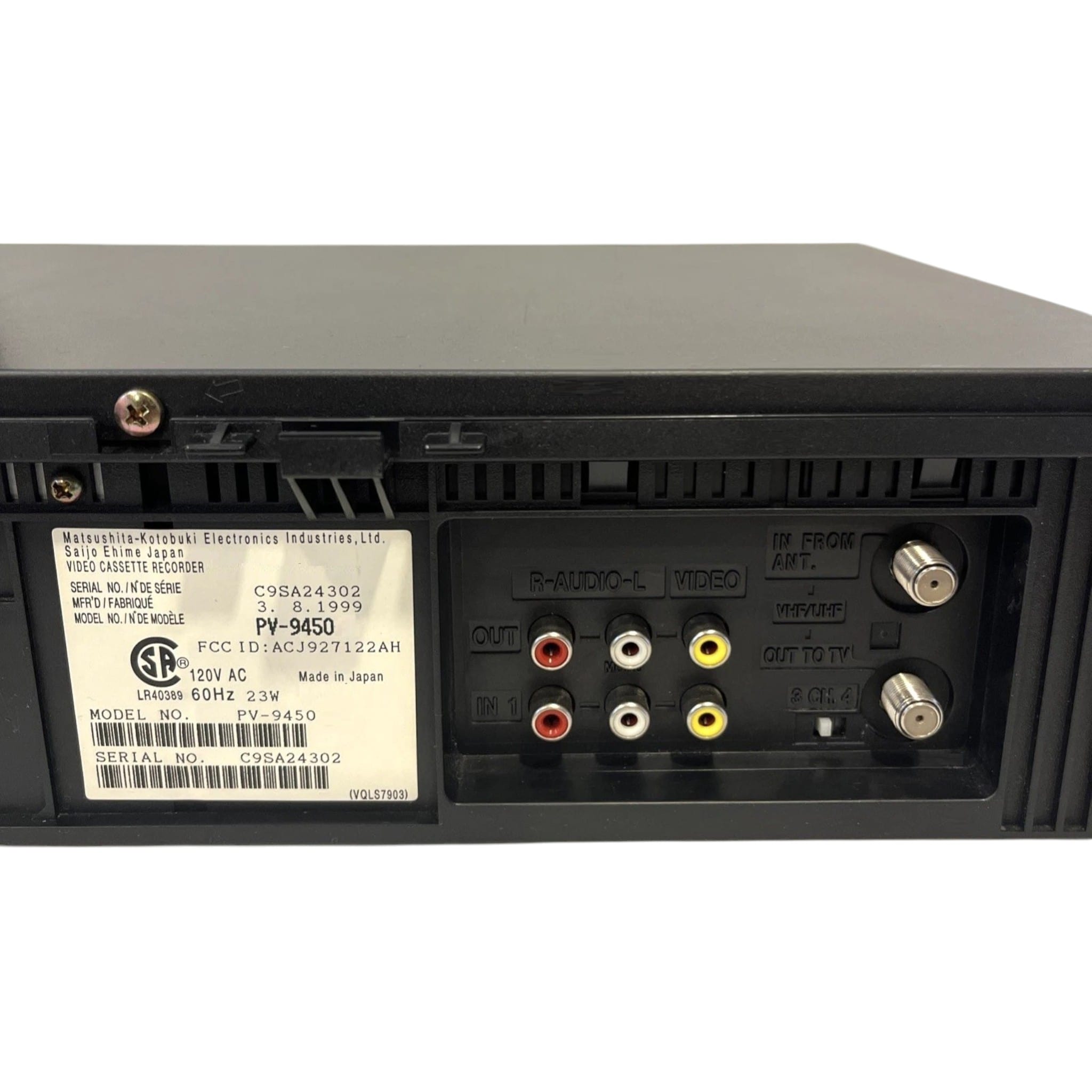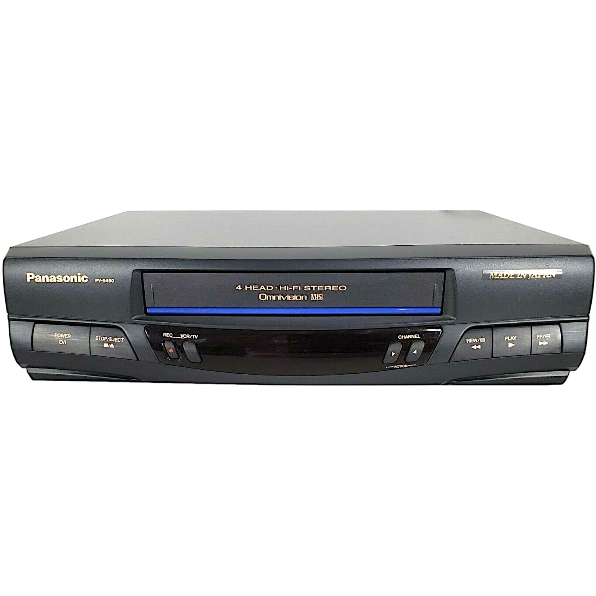 The Panasonic PV‑9450 is a high-performance 4‑head VCR designed for excellent VHS playback and recording. It features Hi‑Fi stereo sound, advanced tape navigation, and a universal remote for added convenience. Whether you're watching classic tapes or preparing for digital transfer, the PV‑9450 delivers reliable performance and clean output.