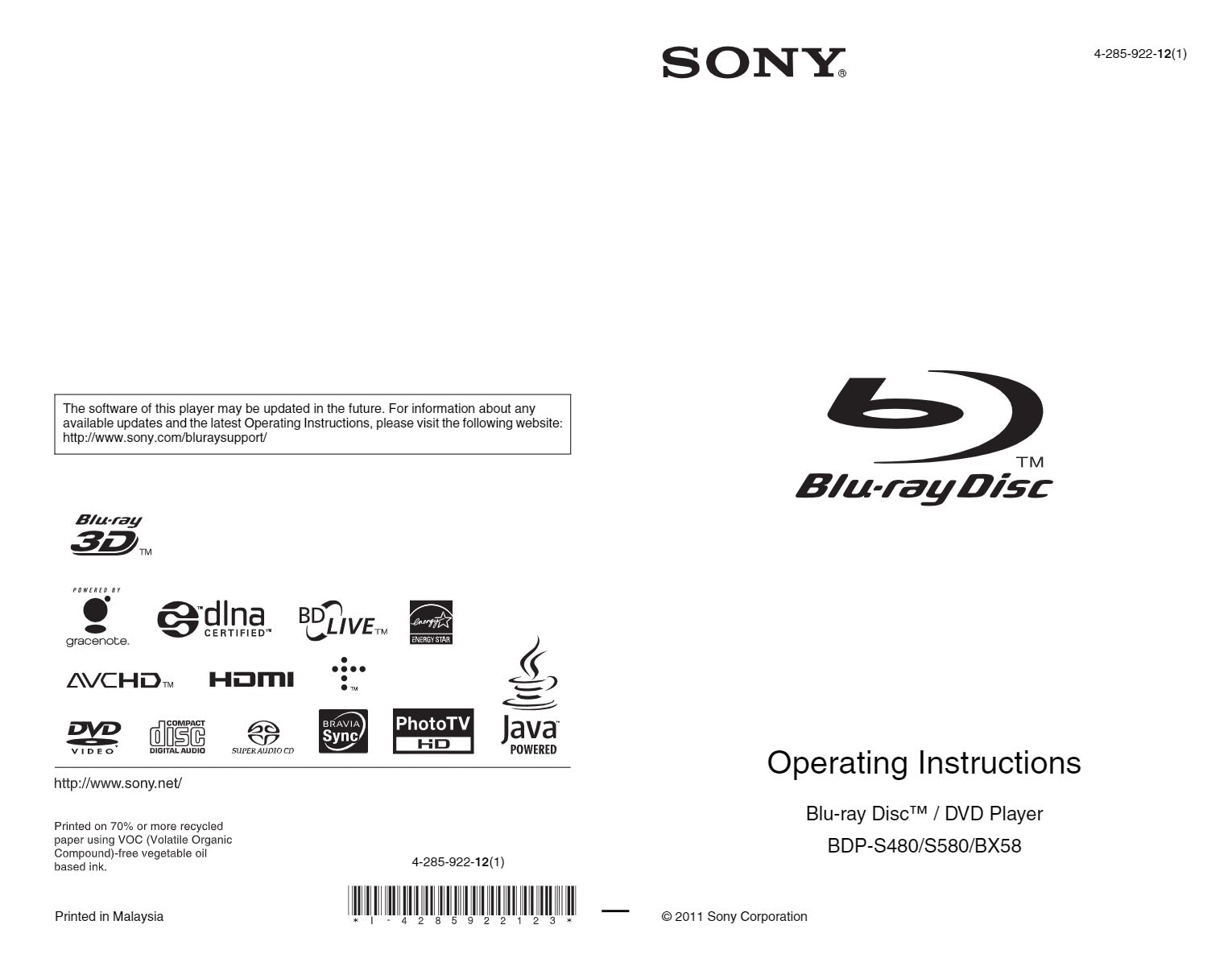 Sony BDP-S580 Blu-ray Player Owners Manual