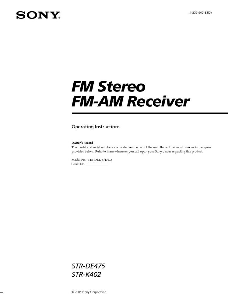 Sony STR-DE475 STR-K402 AV Receiver Owners Manual